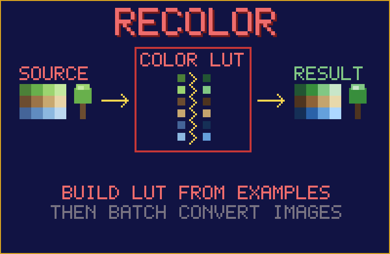 - Recolor — Converts image colors using a color lookup table (LUT) built from example image pairs