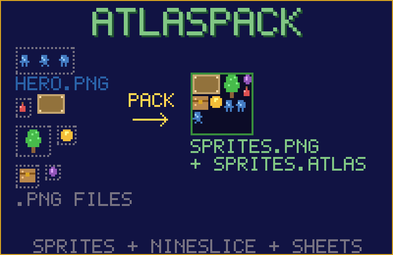 - Atlaspack — Packs multiple PNG images into a single optimized texture atlas with support for nineslice and spritesheets