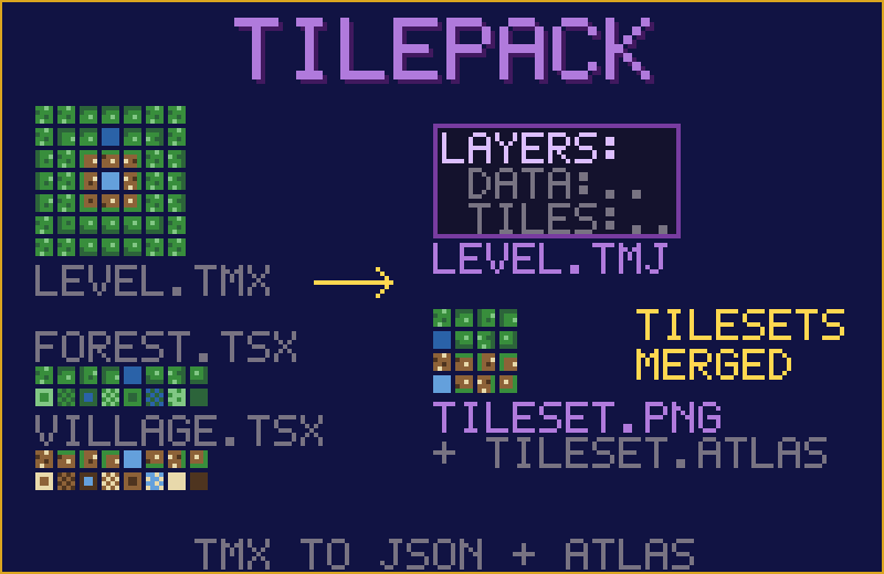 - Tilepack — Repacks and optimizes Tiled map files (TMX) and their tilesets, outputting Phaser-compatible JSON tilemaps