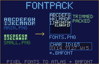 - Fontpack — Creates packed texture atlases and BMFont descriptor files from pixel art font sheets